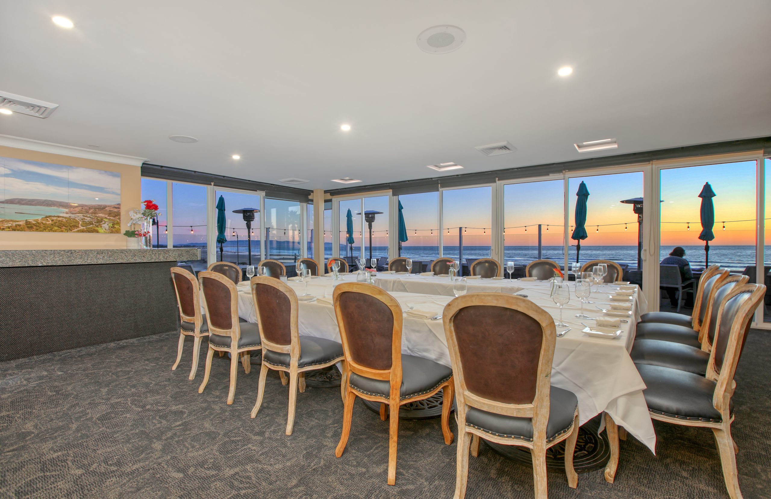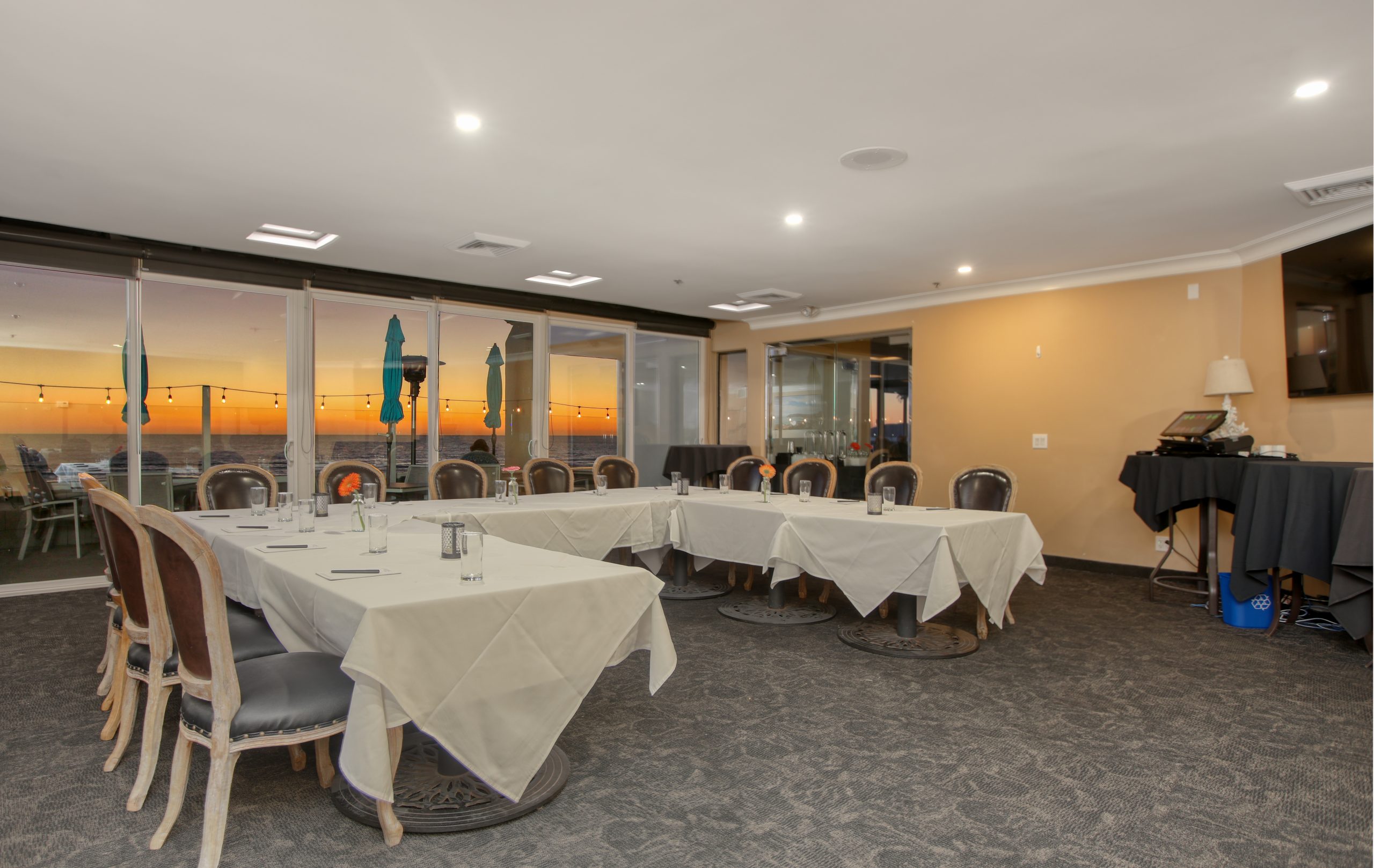 Located on our exclusive top-floor corner spot, this breathtaking private room is filled with natural light, unobstructed ocean views, and a flexible floor plan. The floor-to-ceiling glass doors open onto a private outdoor terrace. Our in-room flatscreen TV make it versatile for meetings, presentations, or a slideshow of photos for your event.